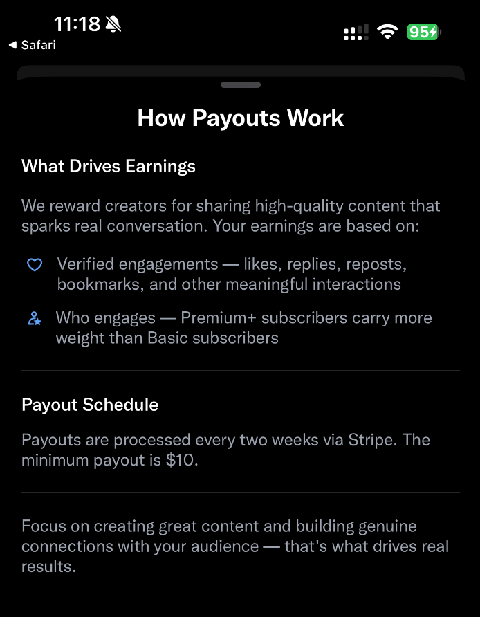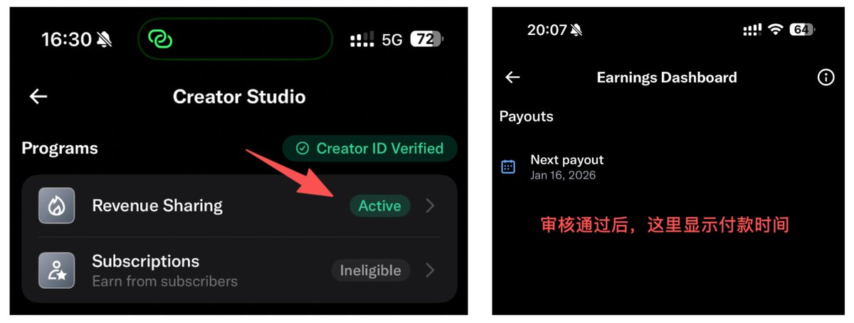 我在开通之后,陆陆续续帮助了一些中推的朋友来开通和设置收款,这个过程中,我也收集了上百位 X 友的真实案例——成功的、失败的、被卡住的、被风控的,把所有坑都整理成了这篇保姆级教程。作为一个已经成功收款的创作者,我可以很自信地说:如果你未来想拿到马斯克的工资,这一篇是必看、必收藏的。